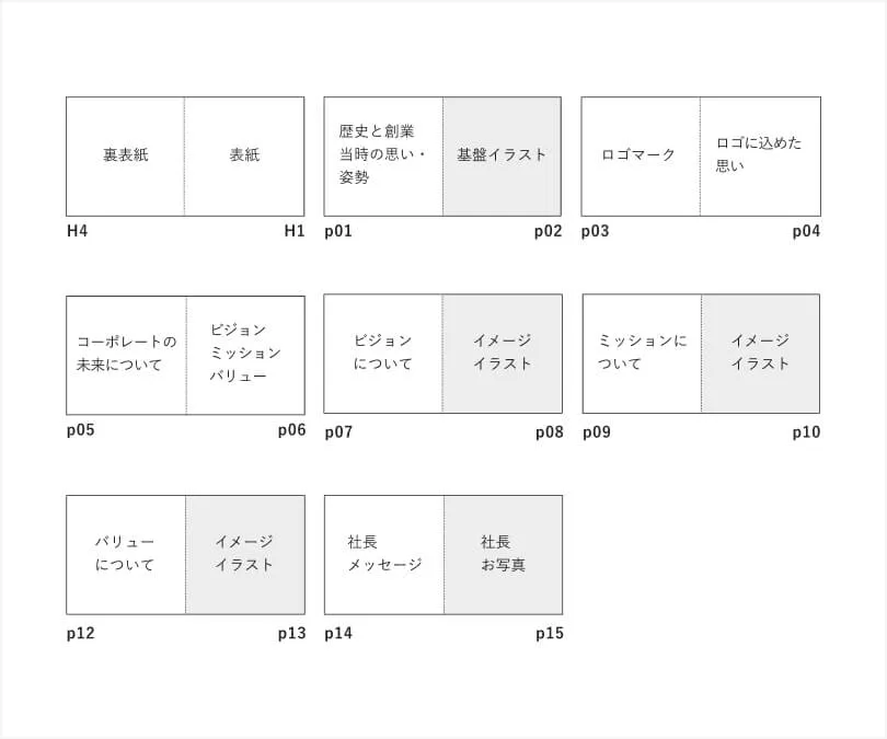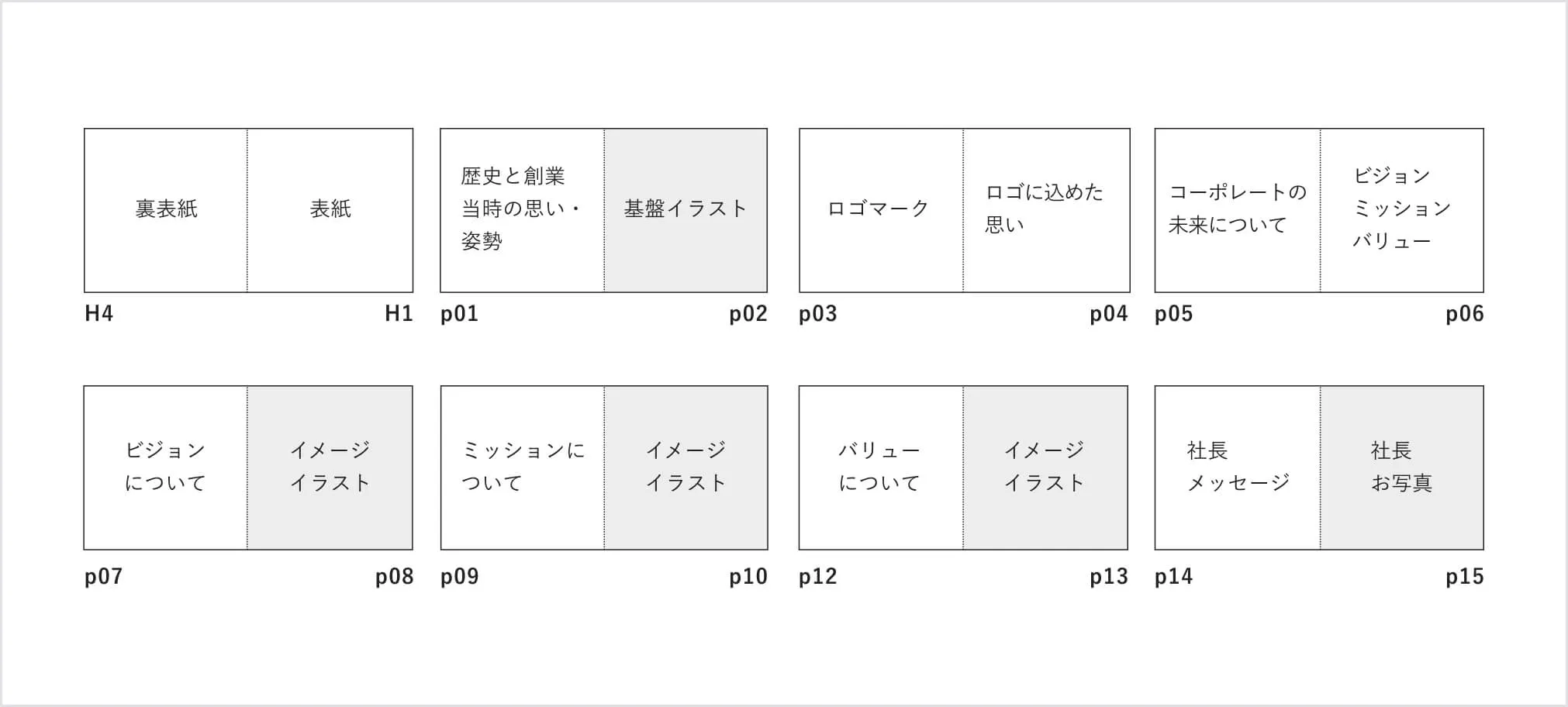 ブランドブックに含めるべき要素をリストアップし、それぞれのセクションの役割を定めます。そしてどのセクションをどう配置するか、流れを考慮してブランドブック全体の大まかな構成を決定します。従業員にわかりやすく伝わるよう、ストーリー性を持たせることが効果的です。