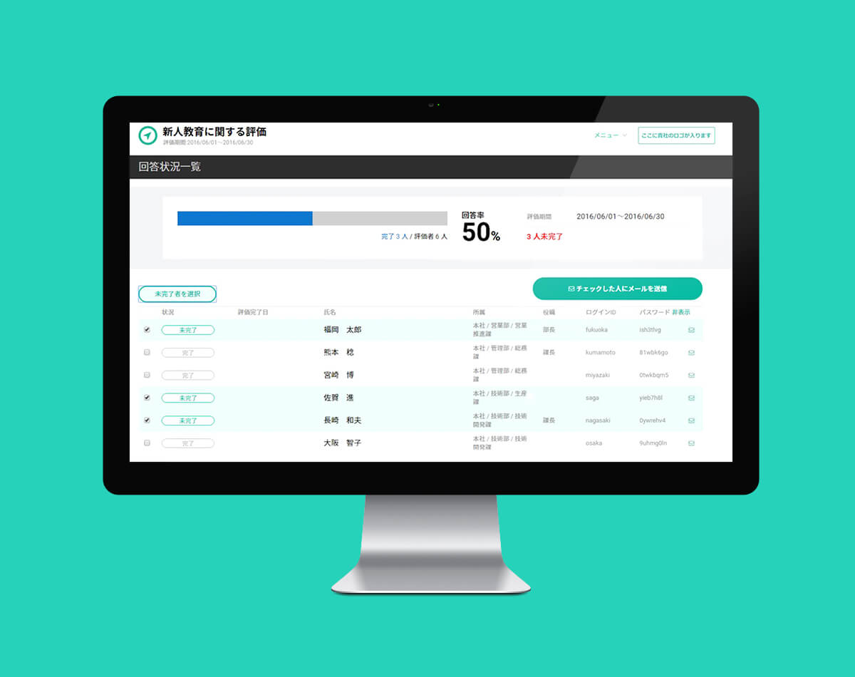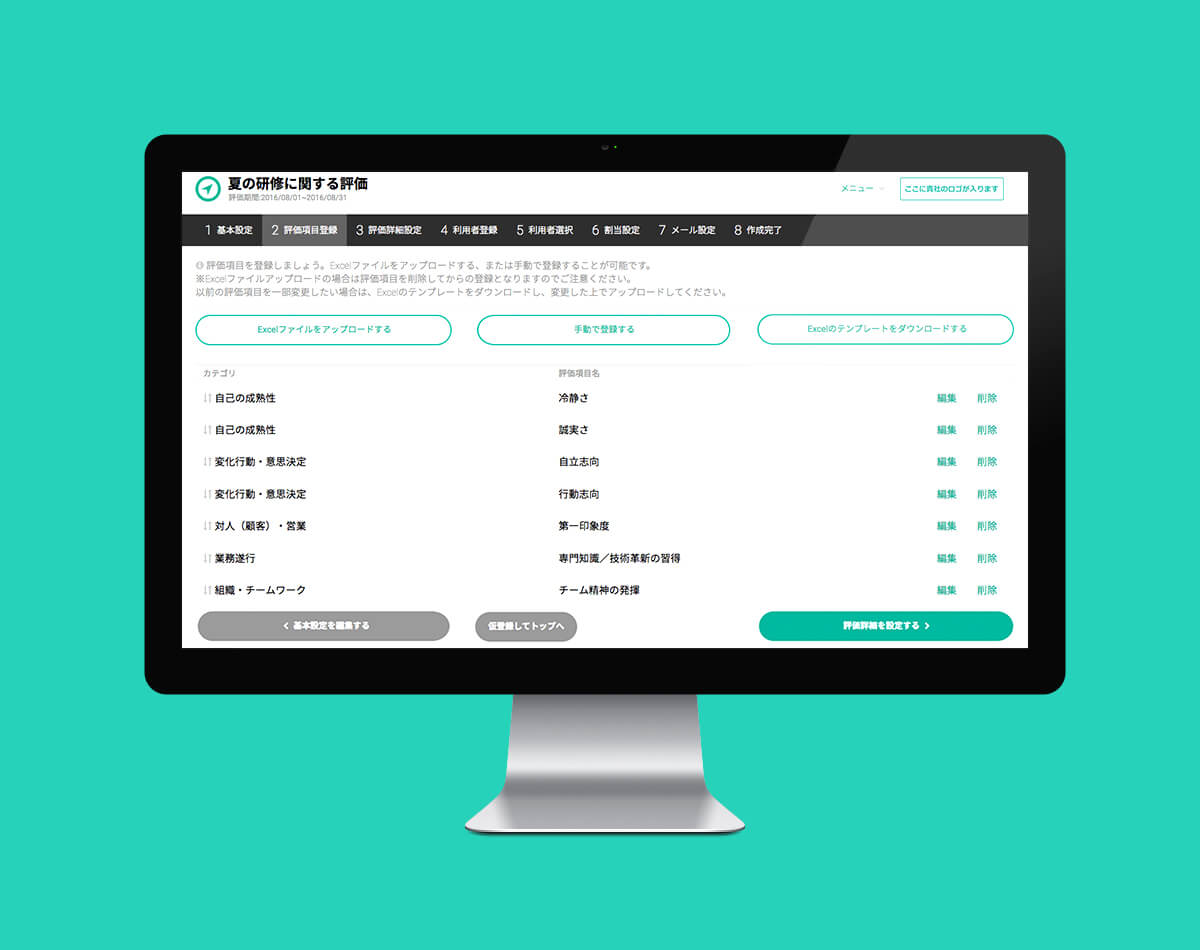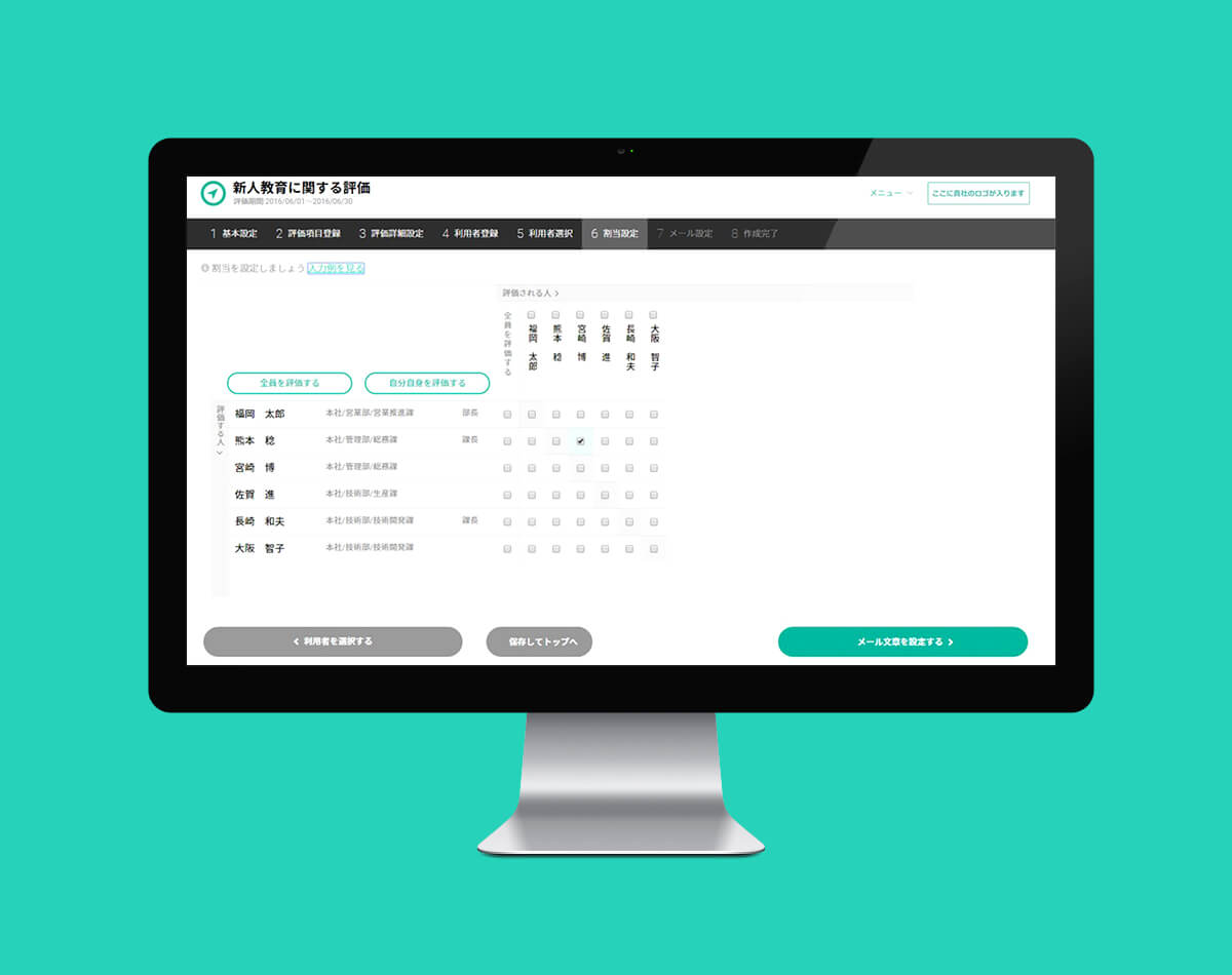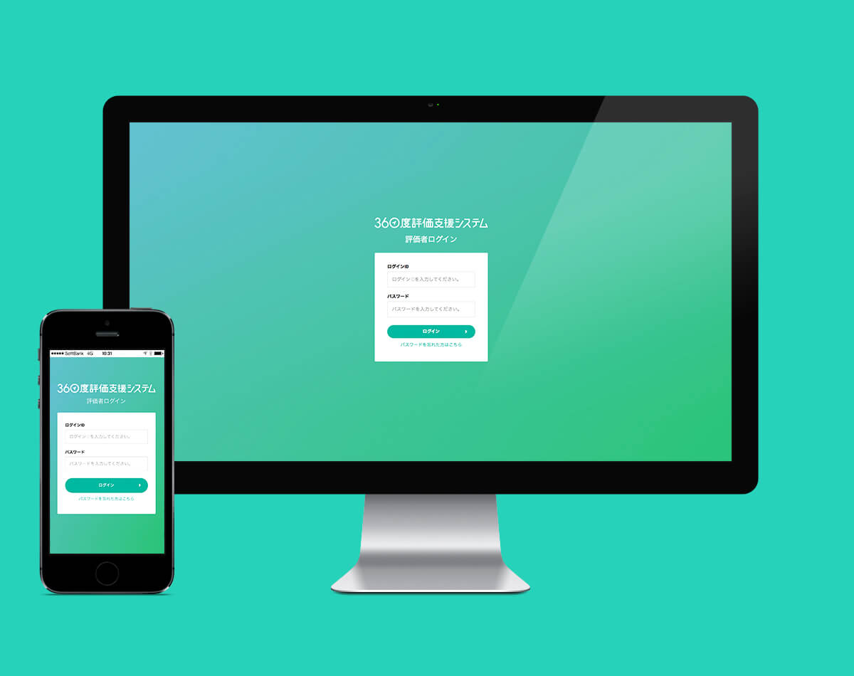 同僚の評価という重い内容を少しでも心地よく行えるよう明るく爽やかな印象の配色にし、スムーズかつ快適に操作できるようなUI設計を行いました。