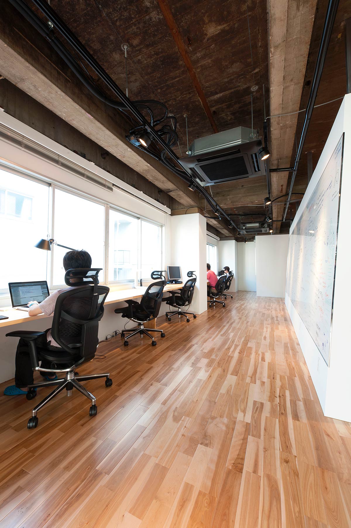 一人の専有面積に余裕を持たせ、スタッフそれぞれがゆっくりと考察し新しいモノを生み出せる空間を意識しました。ディスカッションのもとで研究所としての実験的な試みに取り組むために、大きなホワイトボードをオフィスの真ん中に、ワークビリティを損なわないよう傾斜をつけて設置しました。木の質感や木目の表情によって心身がリラックスし研究という激務を少しでも和らげてもらえるよう考慮しました。