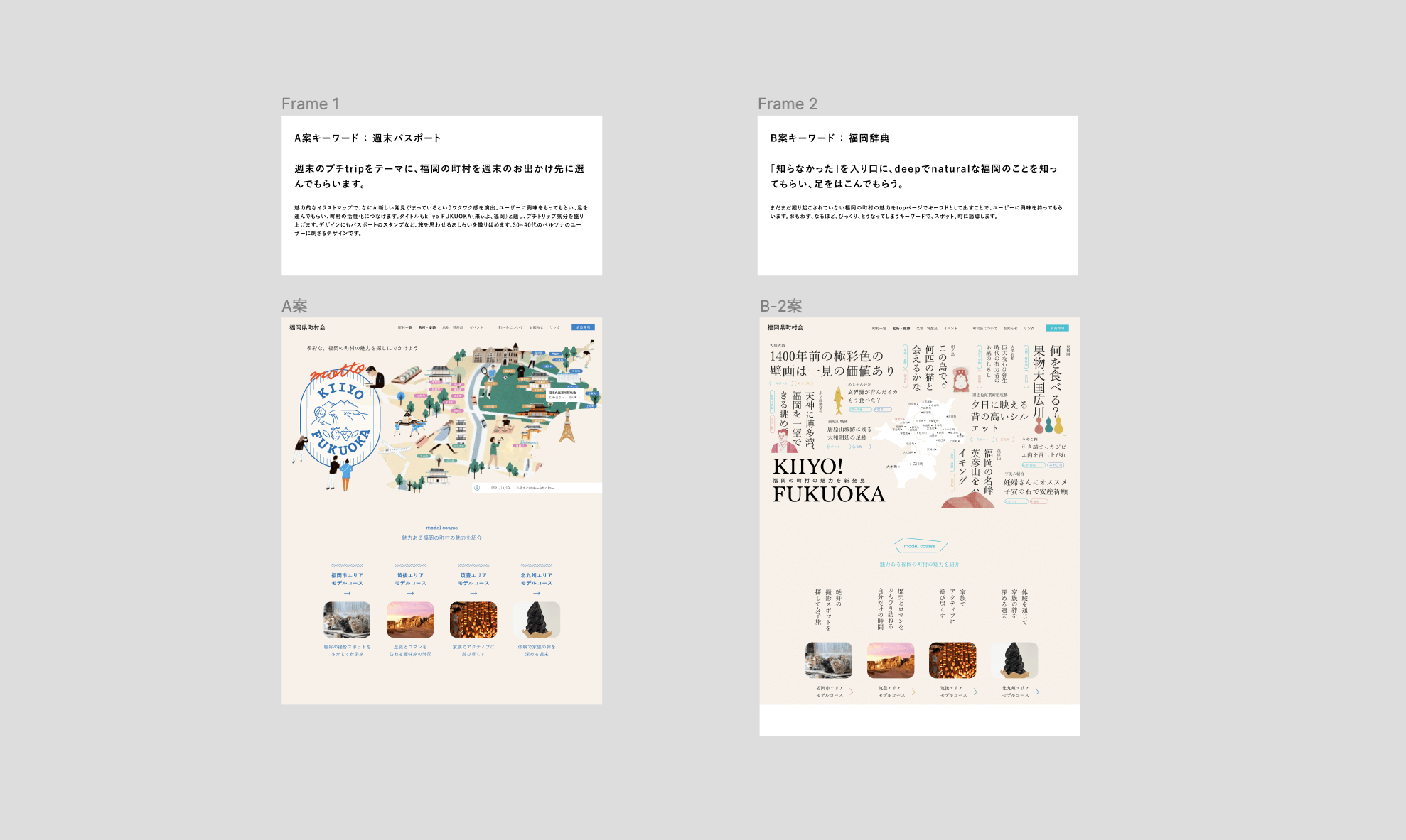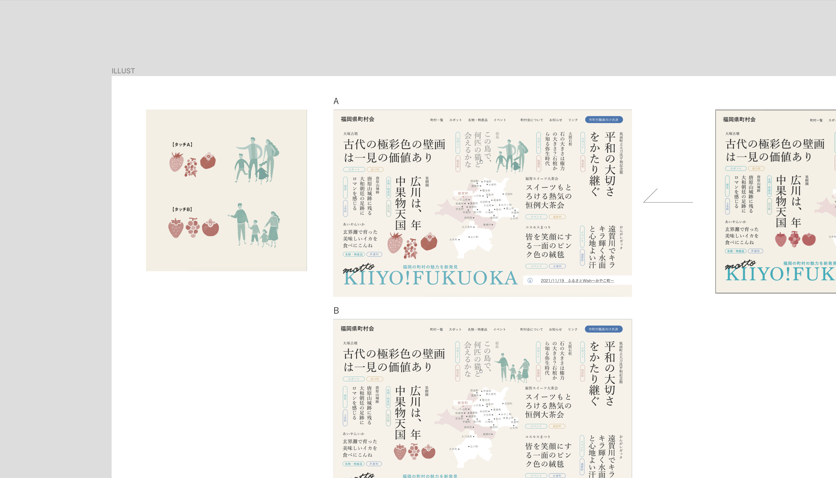 今回はデザインの軸となるメインビジュアルを2パターン制作しました。 A案ではすべてイラストで表現したいという福岡県町村会さまからのご要望もあり、イラストマップで町村をダイナミックにたのしく表現し、週末プチtripのワクワク感を表現しています。 B案では町村の魅力をキャッチコピーでストレートに表現するデザインを企画しました。