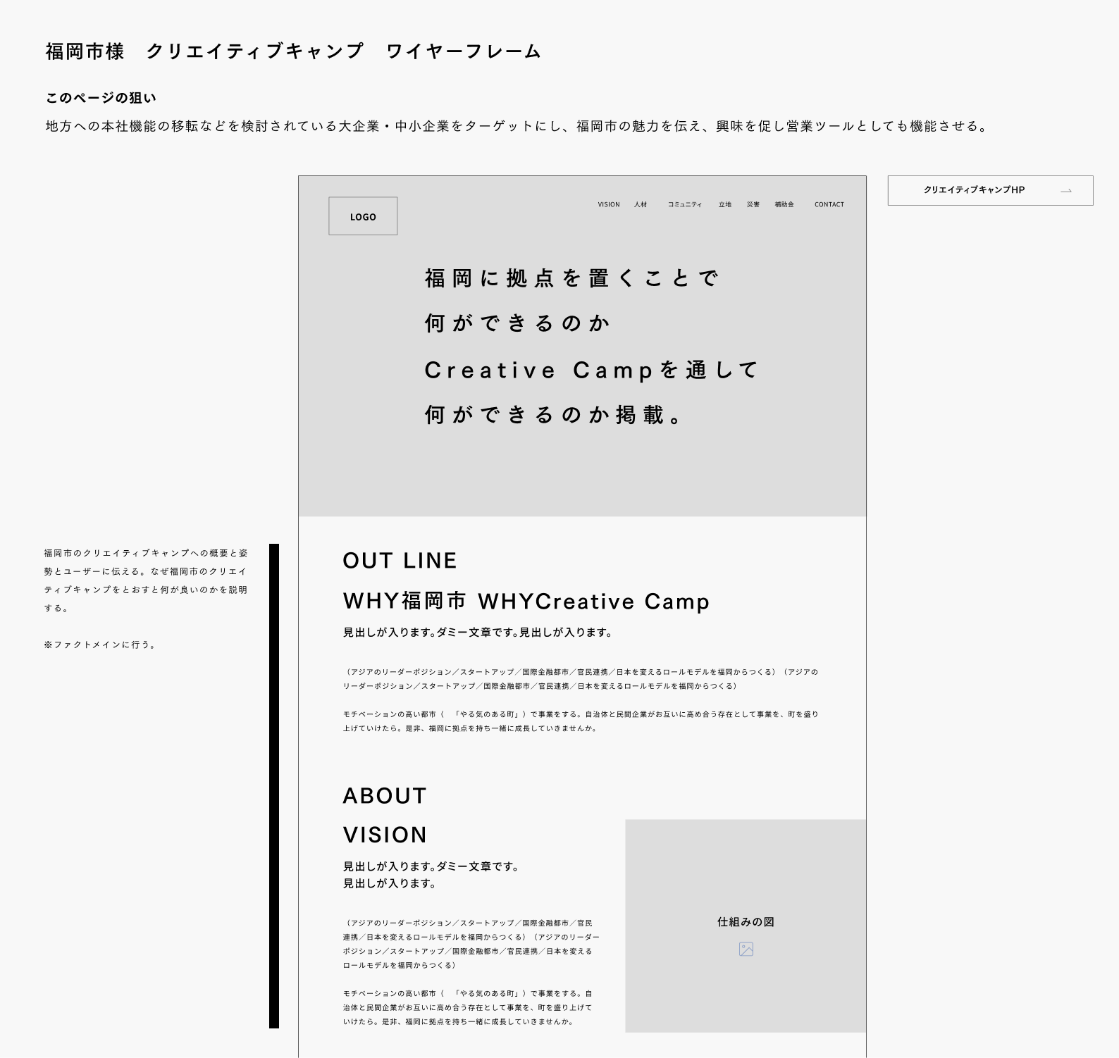 コンセプト・ペルソナ・カスタマージャーニーマップを制作した上で、お客様が組み立てられた情報を元にして、情報の優先度を決めるためのワイヤーフレームを引き直します。情報設計を再考する上では、来訪したユーザーに福岡市様の魅力を最大限に伝えるために、「視覚的にグラフやイラストで表現する」、「データ面は重要な情報にメリハリをつけ明確にする」などの方法を検討しました。また、セキュリティ面やUX改善のため、お問い合わせフォームの設置をご提案しました。