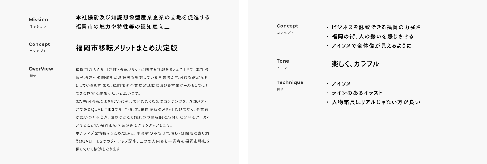 そして、福岡移転のメリットだけでなく、事業者が思いつく不安点、課題などにも触れつつ網羅的に取材した記事を、外部メディアであるQUALITIESで制作・配信することで、福岡市の企業誘致をバックアップします。ポジティブな情報をまとめたWebサイトと、事業者の不安な気持ち・疑問点に寄り添うQUALITIESでのタイアップ記事、二つの方向から事業者の福岡市移転を促していくプロジェクトとなりました。