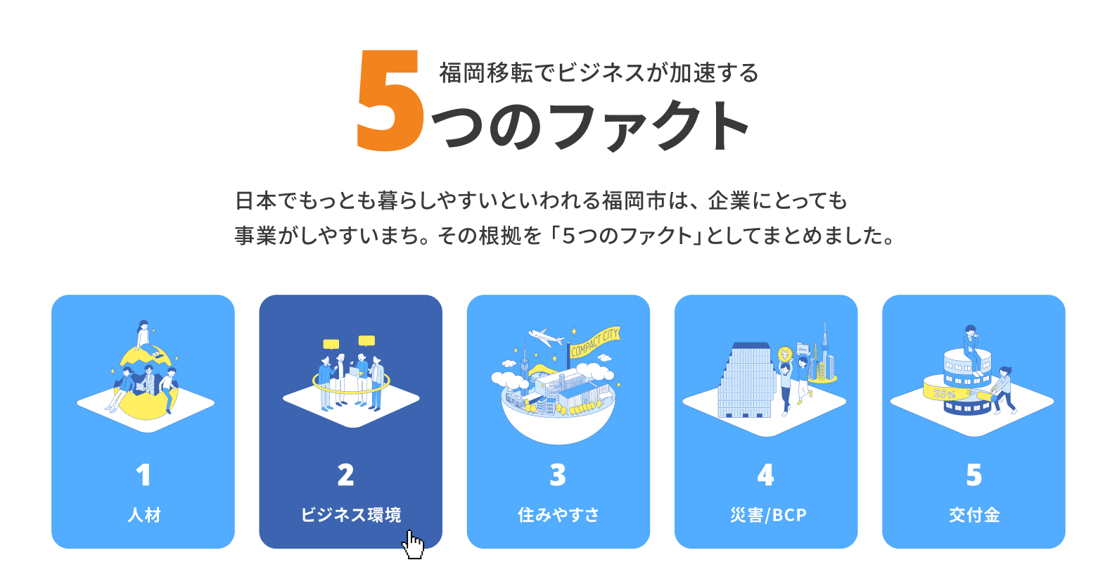 徹底したユーザー目線でWebサイトを制作することで、本社移転や地方への開発拠点新設等を検討している事業者様が福岡市を選ぶ後援できるようなサイトに仕上げることができました。また、福岡市移転をリアルに考えていただくためのコンテンツをデザインでまとめ上げることで、より福岡市に魅力を感じていただけるようなWebサイトとなりました。