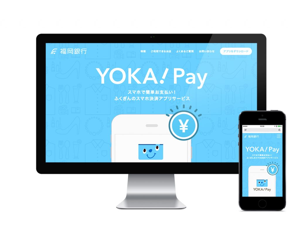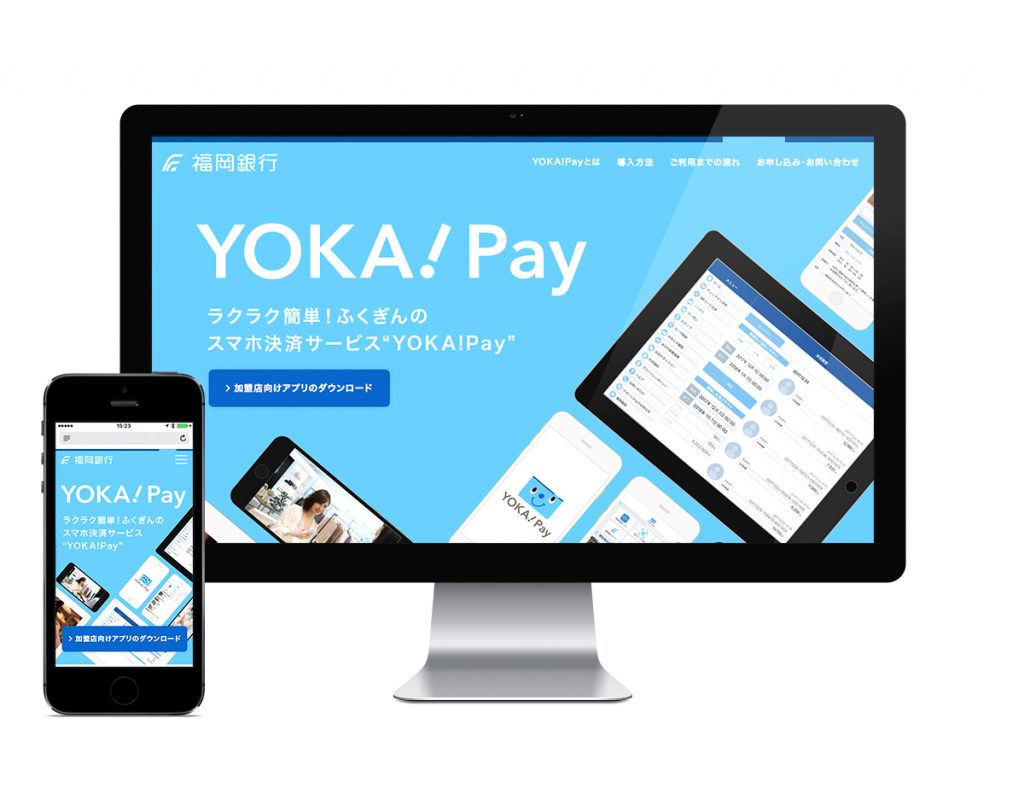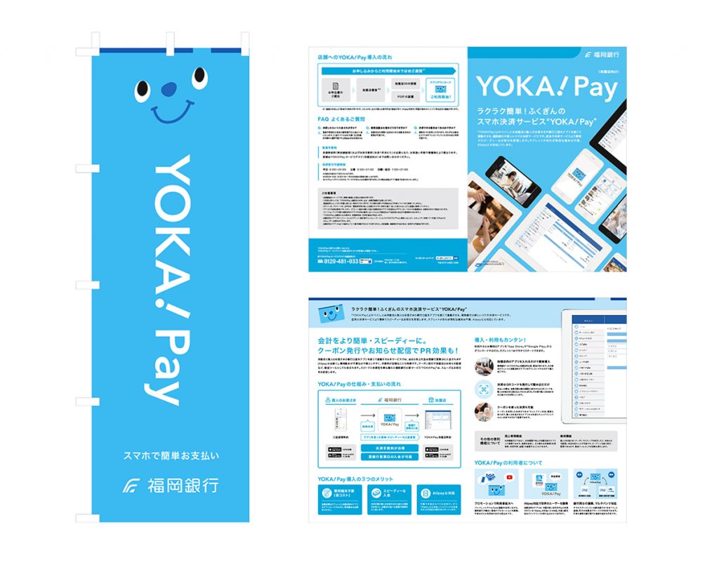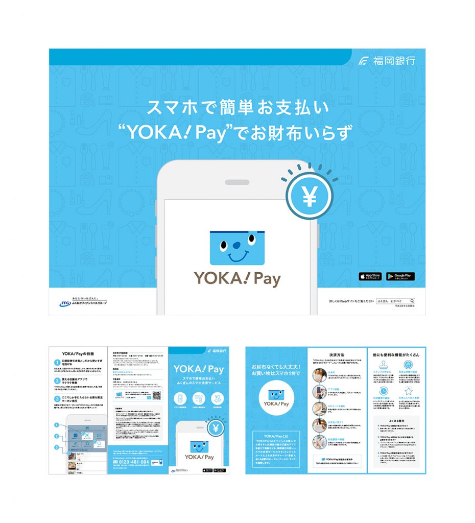 福岡銀行さまのスマートフォン用決済アプリサービス「YOKA!Pay」を紹介するWebサイト、パンフレット、店頭設置用のぼり、ポスター、リーフレット、プロモーション動画を制作いたしました。