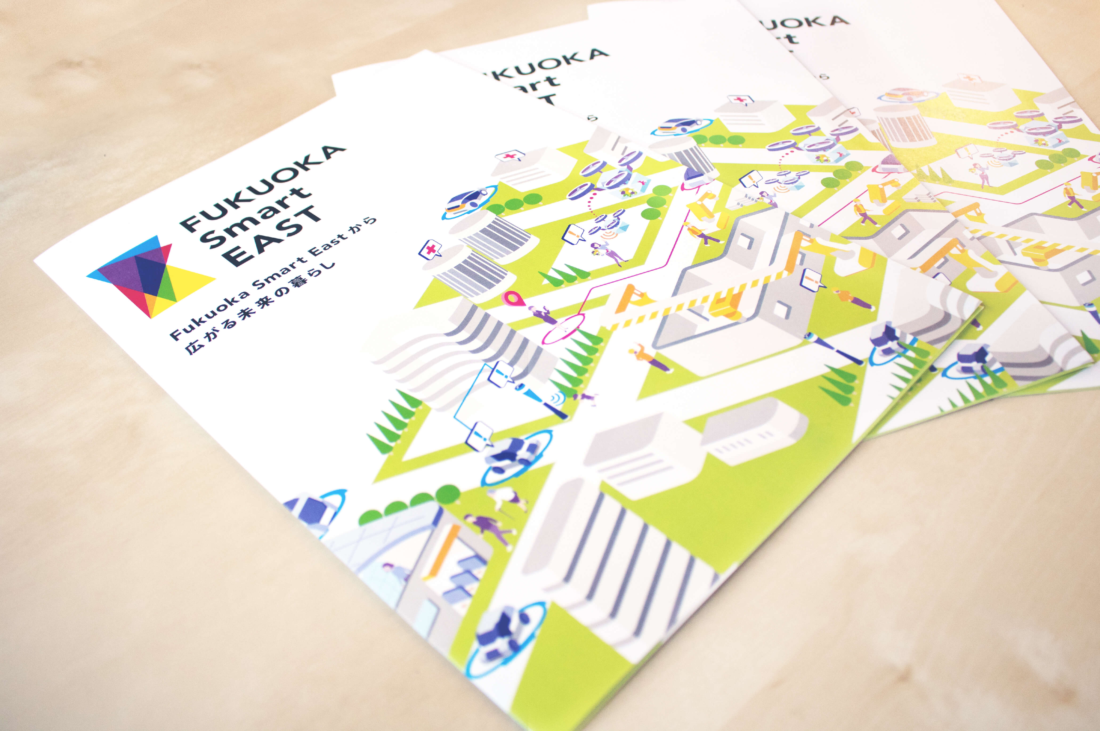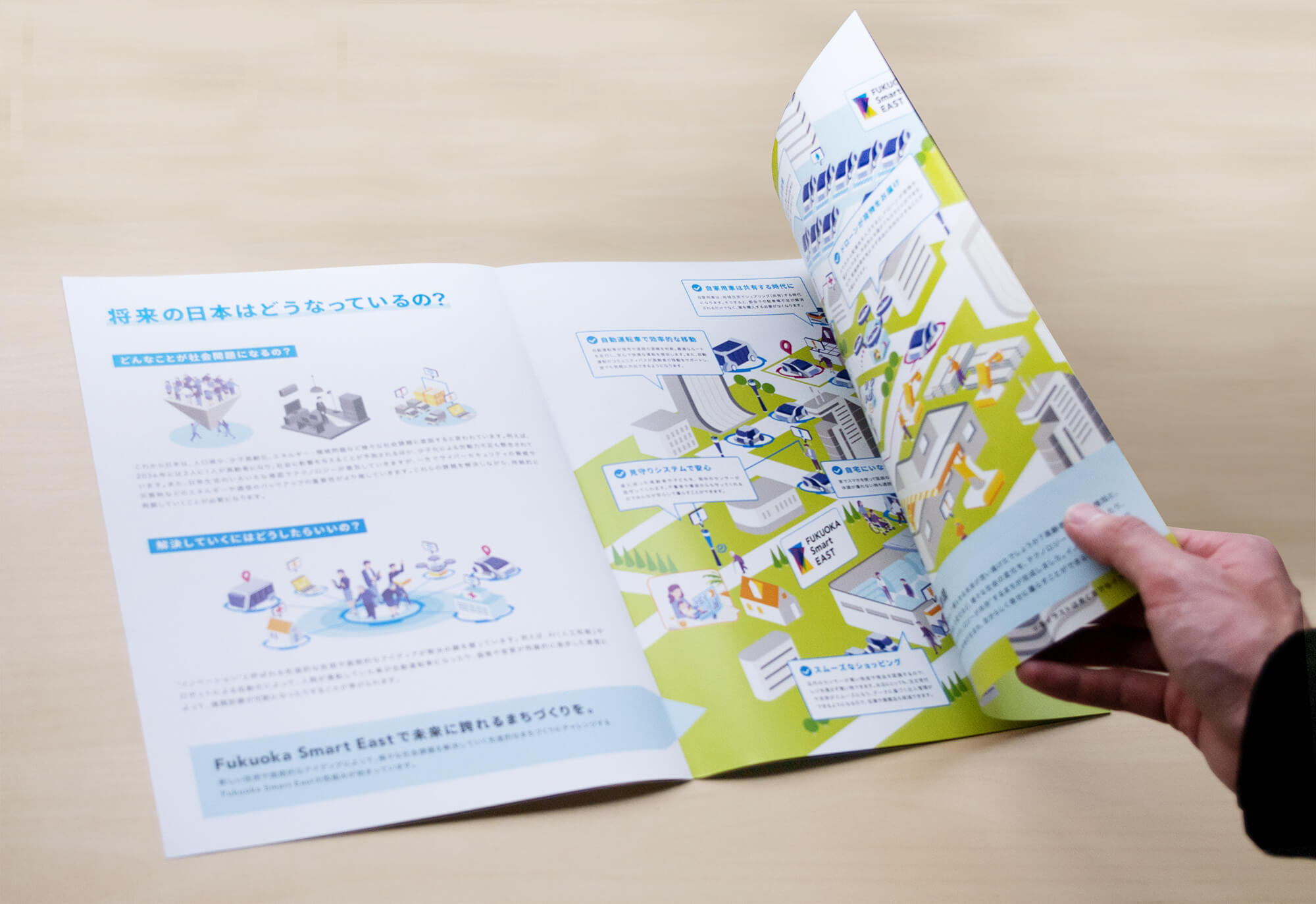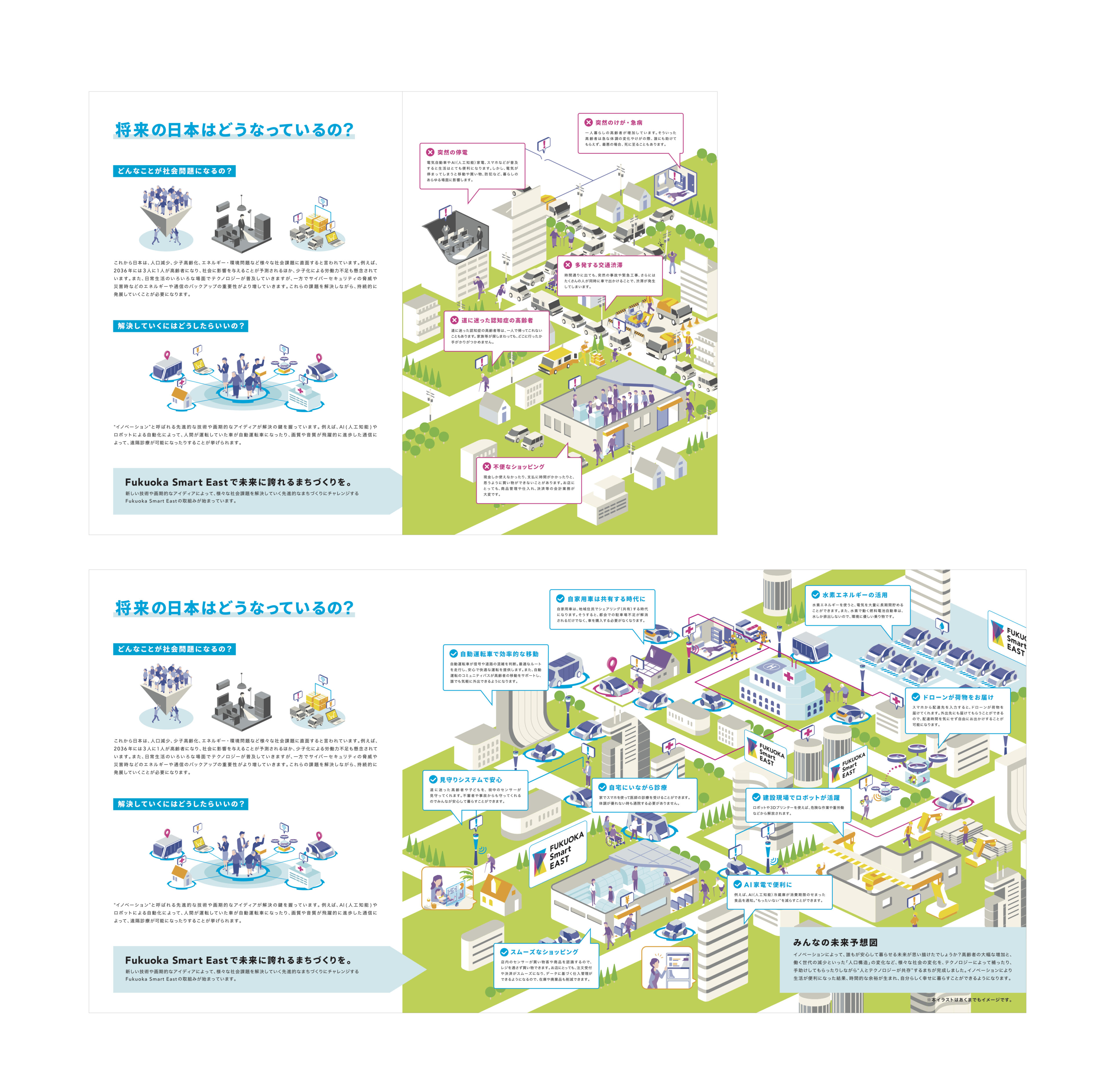 パンフレットでは、次世代を担う中高生が見ても理解でき、未来への期待が高まるデザインを心がけました。中面を開くと、箱崎の未来のまちで人々がテクノロジー等と共存し、豊かに、そして健やかに過ごしている様子が広がっています。現在箱崎が抱えている課題を可視化したイラストを外面に載せて中面とのギャップを作る事で、パンフレットを開いたときのワクワク感を高めます。