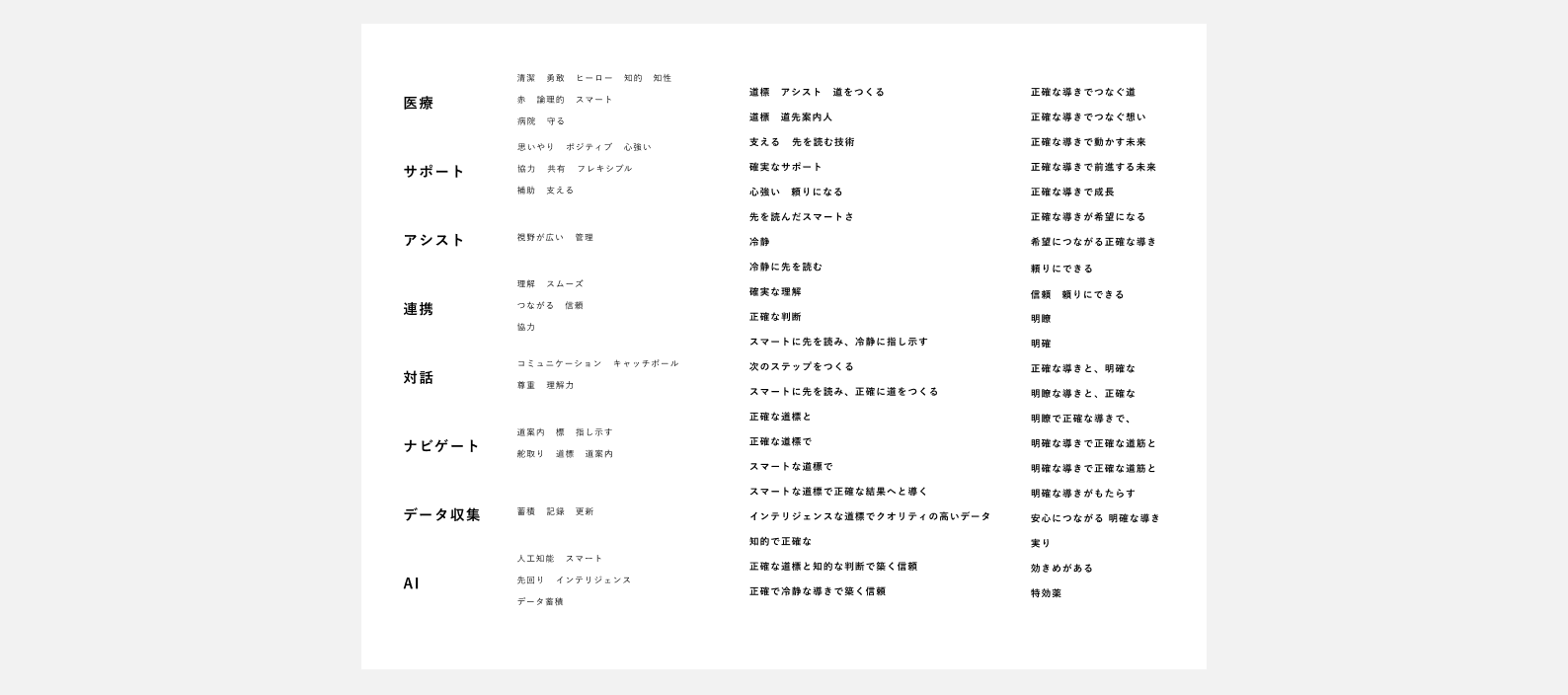 初動では、社内のディレクター・デザイナーと共にIDENというサービスに関する認識のすり合わせを行いました。ブランドを表す単語を書き出し、イメージを構築していきます。
