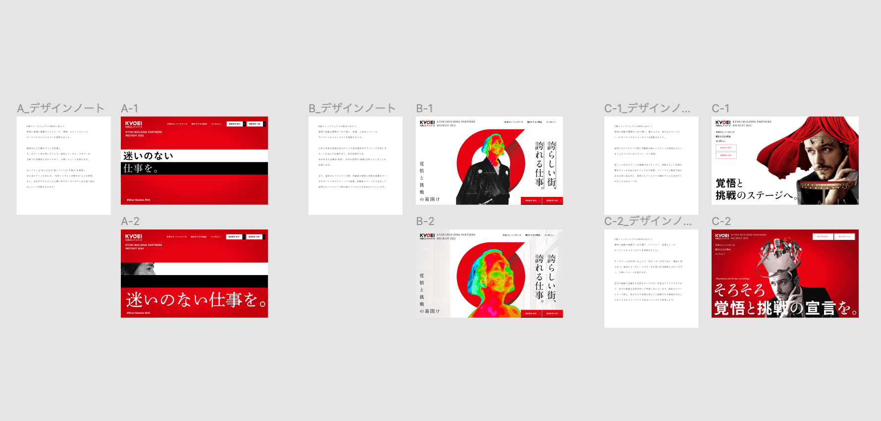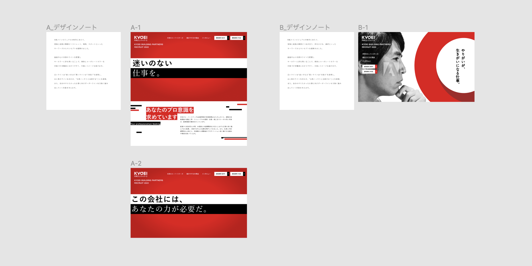 その中から選ばれた1案をさらに展開し、2パターン制作しました。今回のメインビジュアルとなったB案では、コンセプトとなる「覚悟と挑戦の幕開け」から「向き合う、声をかける、選択」というキーワードへ紐解くことで、共栄ビル・パートナーズ様で求職者の新しい選択肢が用意されていることと、寄り添っていることを表現しています。