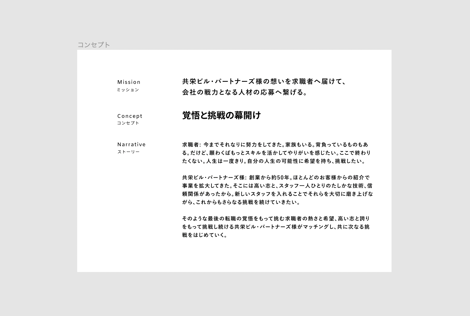 ワークショップで洗い出したキーワードからさらに社内でブレストし、今回のサイト制作のミッション・コンセプト・ストーリーを策定しました。ユーザーの目線を軸に「覚悟と挑戦の幕開け」というクリエイティヴコンセプトを掲げました。