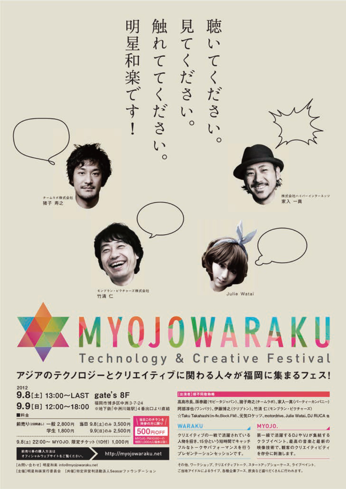 明星和楽2012のロゴマークを制作いたしました。明星和楽とは「アジアのテクノロジーとクリエイティブに関わる人々が福岡に集まる」フェスティバルです。無機質なテクノロジーではなく、「クリエイティブに触発され、感性を揺さぶるテクノロジー」を生むための環境を福岡の地に生み出すことを目的としています。