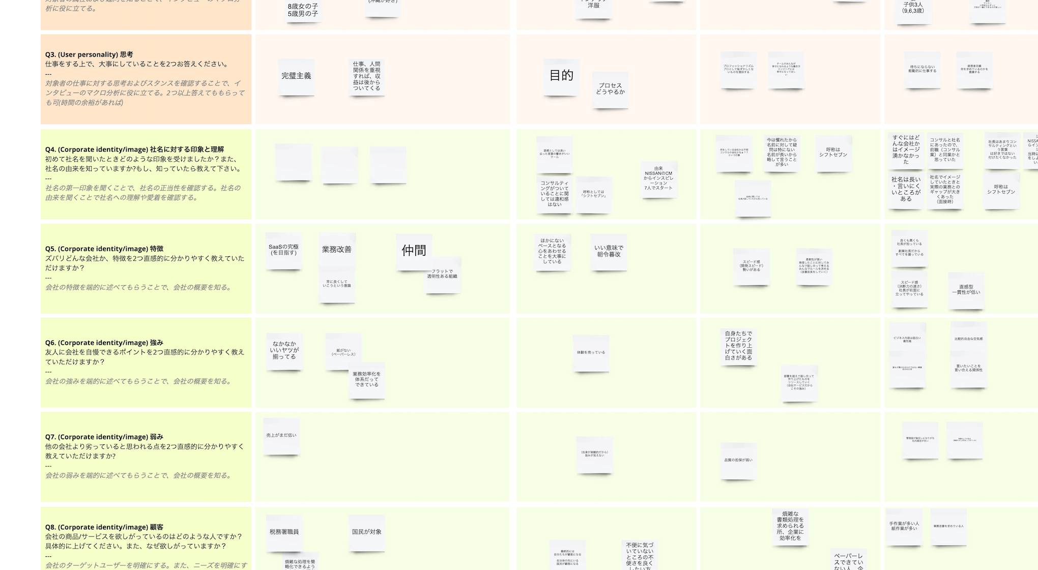 つぎに、シフトセブンコンサルティング様のクライアントである行政機関の方などにインタビューをおこなわせていただきました。内部インタビュー時と同じ内容を質問していき、どのような印象を持っているかをヒアリング。これにより、ブランドアイデンティティーとブランドイメージのギャップをとらえる素材が出そろいました。