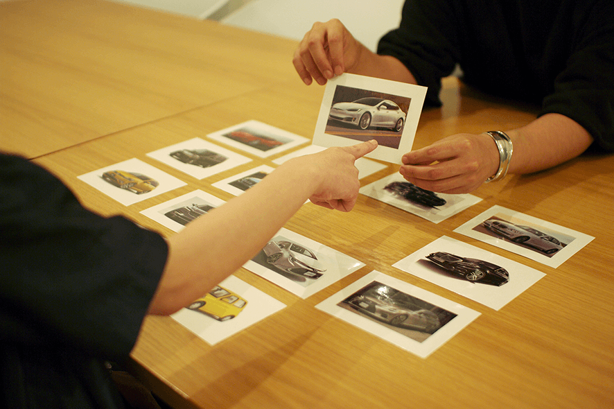 まずはブランドオーナー(=代表取締役社長 井本様)と従業員の内部インタビューをおこない、起業からこれまでの想い、現状の課題、これからのビジョンなどをヒアリングしていきます。そのインタビューにはフォトソート法・ワードソート法という手法を用い、ワークショップ形式でおこないました。さまざまなメーカーの車やコーヒーショップなどの画像を並べ、その中から「自社を車メーカーに例えるなら?」という問いに対して画像を選択していただきます。