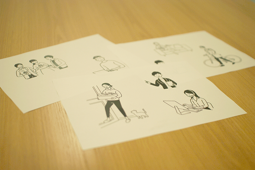 そこで、人々がたのしんでいる様子をイラストで表現することで、各サービスをユーザーに興味をもって見てもらおうと考えました。イラストは、広告や雑誌などで活躍するイラストレーター白根ゆたんぽさんに決定。白根さんの削ぎ落とされた表現が、業務改善というビジネスの内容とマッチし、さらにどこかユーモラスなトーンが、人間味を表現できるという考えでのコラボレーション。